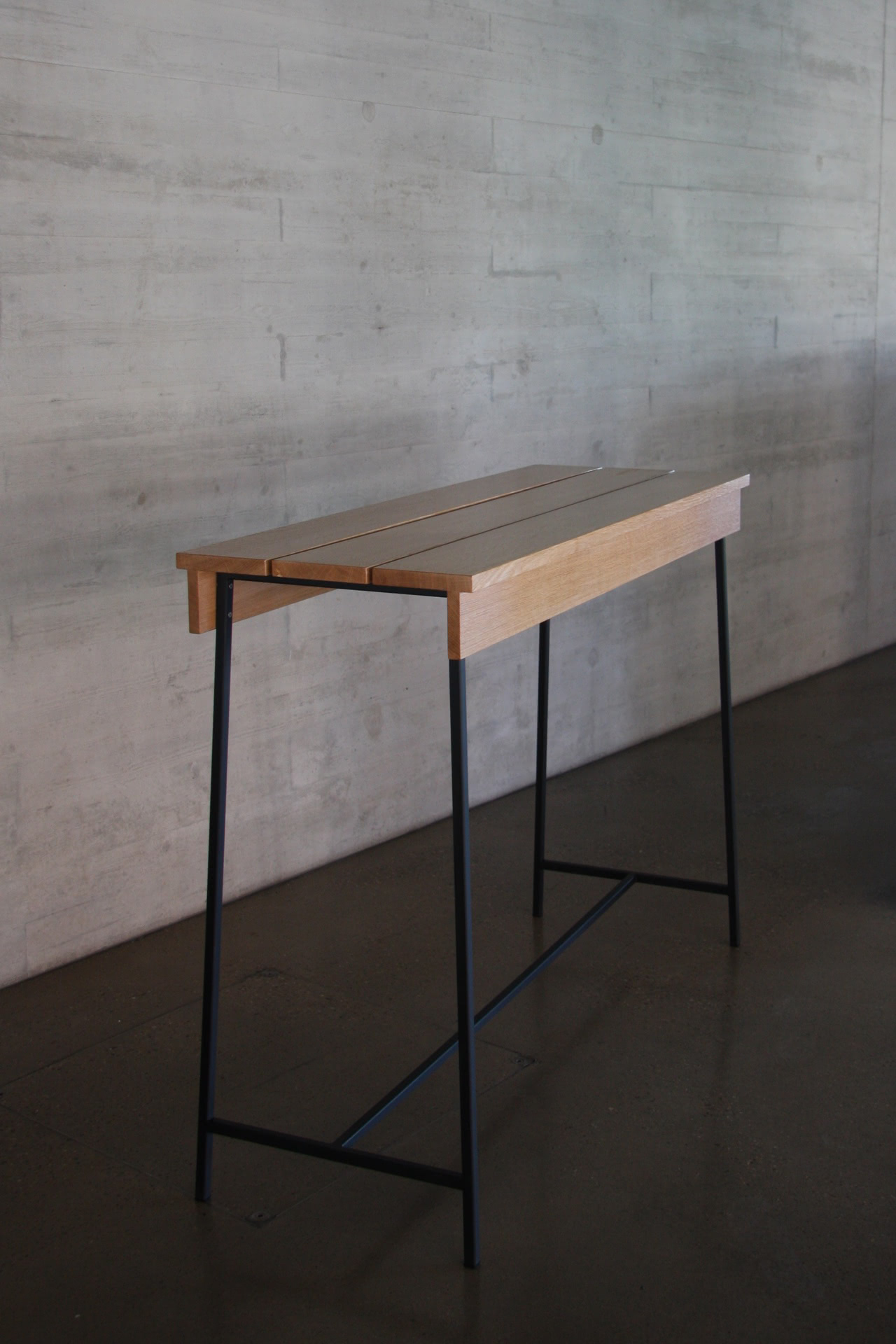 Ein einfacher, länglicher Stehtisch mit einer Tischplatte aus Eichenmassivholz und einer Rahmenkonstruktion aus Schwarzstahl.