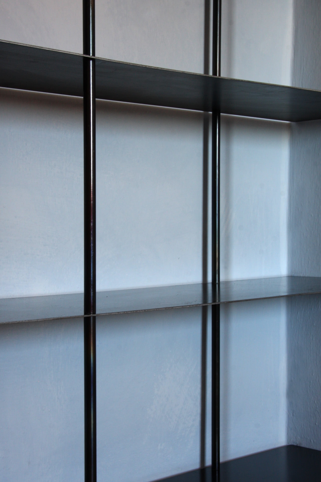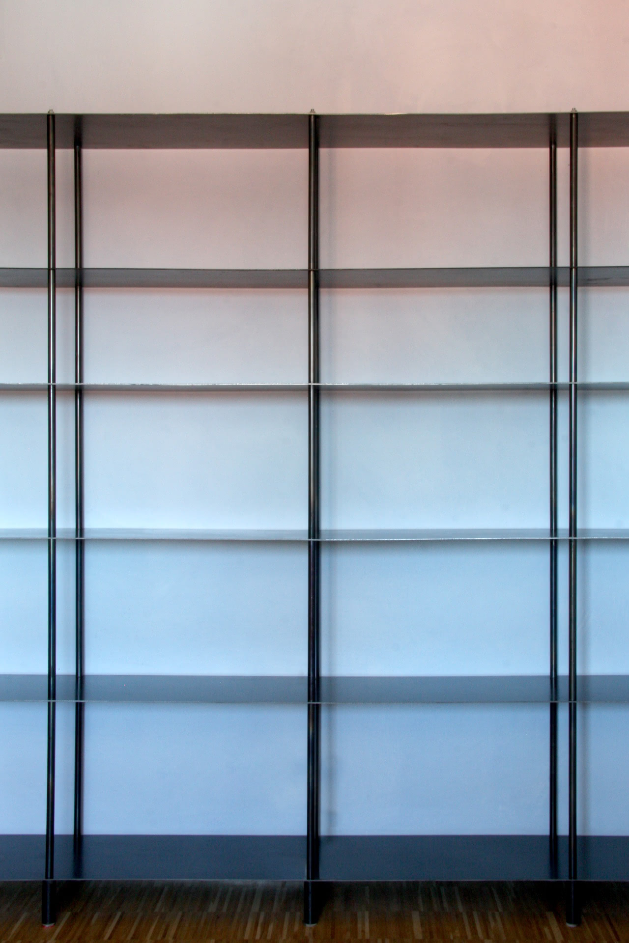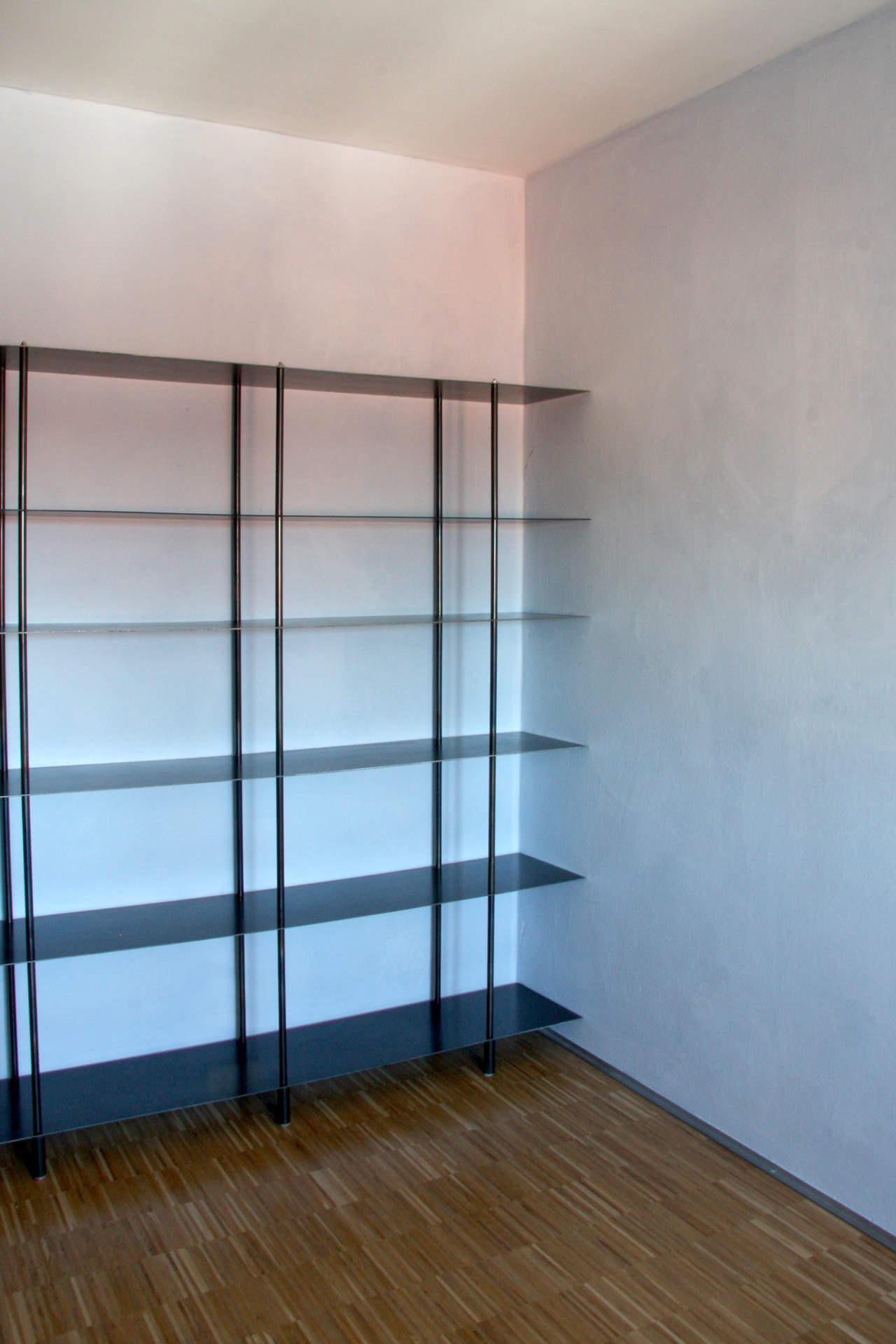 Dieser Regalentwurf ist auf das Minimum reduziert. Vertikale Rundeisen und horizontale, dünne Bleche lassen das Regal im gefüllten Zustand nahezu unsichtbar wirken.
